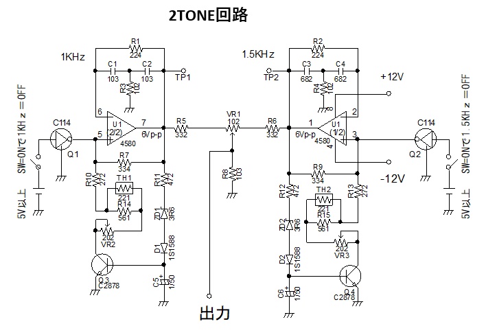 VR (VR2/VR3) so that the output of each signal (1KHz/1.5KHz) is 6Vpp at