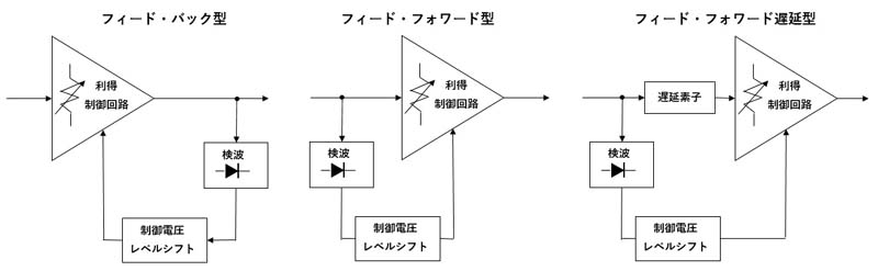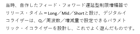 そもそも自作派にとって一番手に付け易いブロックが、マイクアンプとか音に色付けするトーンアンプとかスピーチアンプ類が一番多く作られているのではないでしょうか。最近のメーカー製機器では中は触り難く、周辺機器としてのアクセサリーは多く自作されています、その中で送信機としては、ある一定の出力以上は出ないように制限をかけるALC機能が付加されています。大きな声をマイクに向かってはり上げるのはスプラッターをまき散らす要因となります、歪の少ないスプラッターのない電波が良い音に聞こえると思います、Hi-FiSSBと言う言葉を耳にしますが、Hi-Fiの定義が疑問です、そもそも3KHz帯域SSBでHi-Fiはあり得ないと思うのですが、おそらく3KHz帯域内でのより聞きやすい(耳あたりの良い)音をHi-FiSSBと称しているのだと思います。私が無線を再開した頃(1987年頃)にQSO話を聞いていると、送信機のALCを振らせては絶対ダメだとかスプラッターが出るからマイクゲインを下げろとか、よく耳にしました。たしかに、定格100W送信機では出来るだけ常に定格出力で運用したいものです、その結果オーバードライブとなり歪んだ電波となっていました。そこで、いくら大声をはり上げても歪電波とならないようにリミッティングアンプたるものを自作しました。しかし、自作のきっかけは各局のQSOを聞いていて非常にパワー感のあるバックノイズのデカイ信号でコックピット感覚の電波に憧れて、どうすれば、このような電波が発射出来るのか、マイクゲインを上げれば可能だがスプラッターもなく歪もないパワー感のある信号を生成したかったのです。![]() 一般的にはフィード・バック型で、出力レベルが目標とするレベルを超えると前段の利得を抑えるタイプで結果がオーバーしなければ制御出来ません。出力レベルを検出してから利得制御するまでの時間をアタック時間と称し、この期間を如何に短縮するかがポイントになります。フィード・フォワード型は目標とする出力レベルを利得制御回路の後段から信号検出するのではなく、前段から検出し、だいたい出力レベルはこんなもんじゃと予測をして利得を制御する方式で、これでもアタック期間をゼロにすることは困難である。過大入力信号の検出を前段から検出するか後段から検出するかで方式が分かれます。更に、アタック期間による歪を完全に解消する方式としてフォワード遅延型がある、これは利得制御するための検出信号が生成されるまでの時間(それ以上の時間)を遅らせることにより、先回りして利得制御することによりアタック歪を完全に解消するものです。 【フィード・フォワード遅延型】 この方式はレベル検出した信号が、レベルが規定値を超えたと判断し利得制御するまでの時間(アタック時間)以上の時間値を遅延させることにより、この時間だけ先回りしてレベル制御しアタック歪を解消します。問題なのは遅延素子として使用するデバイスがS/Nの良い歪の少ない素子が存在するかどうかです。全体をデジタル化することにより構成すれば容易に出来ます、本信号をデジタル化する場合はアナログ→デジタル(A/D変換)、デジタル→アナログ(D/A変換)ブロックが心臓部となり、特に自作となると変換部のレイアウト配線処理で大きく性能を左右します。遅延素子として実現可能なものは、①BBD(バケツからバケツへ電荷を転送する)デバイス ②昔のオーディオエコーシステムで使用された残響バネ ③RAMへのリードライト処理 の3種類位考えられます。 ① BBD 信号をサンプリングして次段へと供給し、段数が多い程長い遅延時間が確保出来、サンプリング周波数が低い程長い遅延時間が確 保出来るCDのサンプリング(44.1KHz)と同じように理論的な再生周波数は44.1KHz/2=22KHzとなるが、 サンプリングノイズ を考慮すると最高再生周波数の4倍以上が望ましい、となると、ここに使用するサンプリング周波数>3KHzX4=12KHzとなり、必 要とする遅延時間値の段数を選択することになります。 しかし、この種のデバイスはカラオケ機器に開発されたもので50dB以上 の歪を得ることは困難です。 ![]() デジタル信号処理と考え方は同じで、サンプリングは連続時間を離散化(連続していないとびとびのこと)したもので一定時間 毎に数値化する、この量子化したデータをデジタルと称している。 ② 残響バネ 昔のステレオ音響装置(真空管時代)は、エコー機能を実現するために用いられた部品で、電気信号をトランスデューサーで械振 動に変換し機械的バネを通過させ再度トランスデューサーで電気信号に戻す機能です。バネの長さで遅延時間が決まり帰還ループ させ帰還量をVRで可変しエコー機能を増減させ、真空管アンプを製作した頃に遊んだ記憶があります。本部品は帯域がとれません ので不向きです。と言うより時代錯誤です。 ③ RAMへのリード/ライト処理(デジタルディレー) 本命は、この方式になるでしょう、サンプリング>12KHz、段数はRAMの容量となります。 ![]() (書き