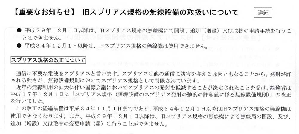 平成34年度からアマチュア無線に対して新スプリアス法が施行される話は耳にするのですが、具体的に何がどうなるのか定かではありません。電気的特性内容に関してはネットでも確認出来ますが、我々にとってはその内容よりも具体的申請手続きを知りたいものです。雑誌・ネット等でかなり明確になってきましたが、この度、申請→認定→受理の手続きが完了しましたので、参考に紹介しておきます。最近、QSOのお話をワッチしていると、本題関連の話を時折り耳にします、この中で、200W以下の局とハイパワー局との区別なしにお話しをされて、混同されているアマチュア局も多いのではないでしょうか。200W以下の局は新旧機器にかかわらずスプリアス対応機器であれば、型名・技適番号(JARL登録番号)で保証認定申請が出来るので、送信機’取替’又は’増設’で簡単に可能です。ここではハイパワー局での対応又は、自作機に対しての申請内容に関して掲載しておきます。下記のような通達もあり、平成29年11月30日までに申請手続き完了した方が賢明みたいです。![]() |