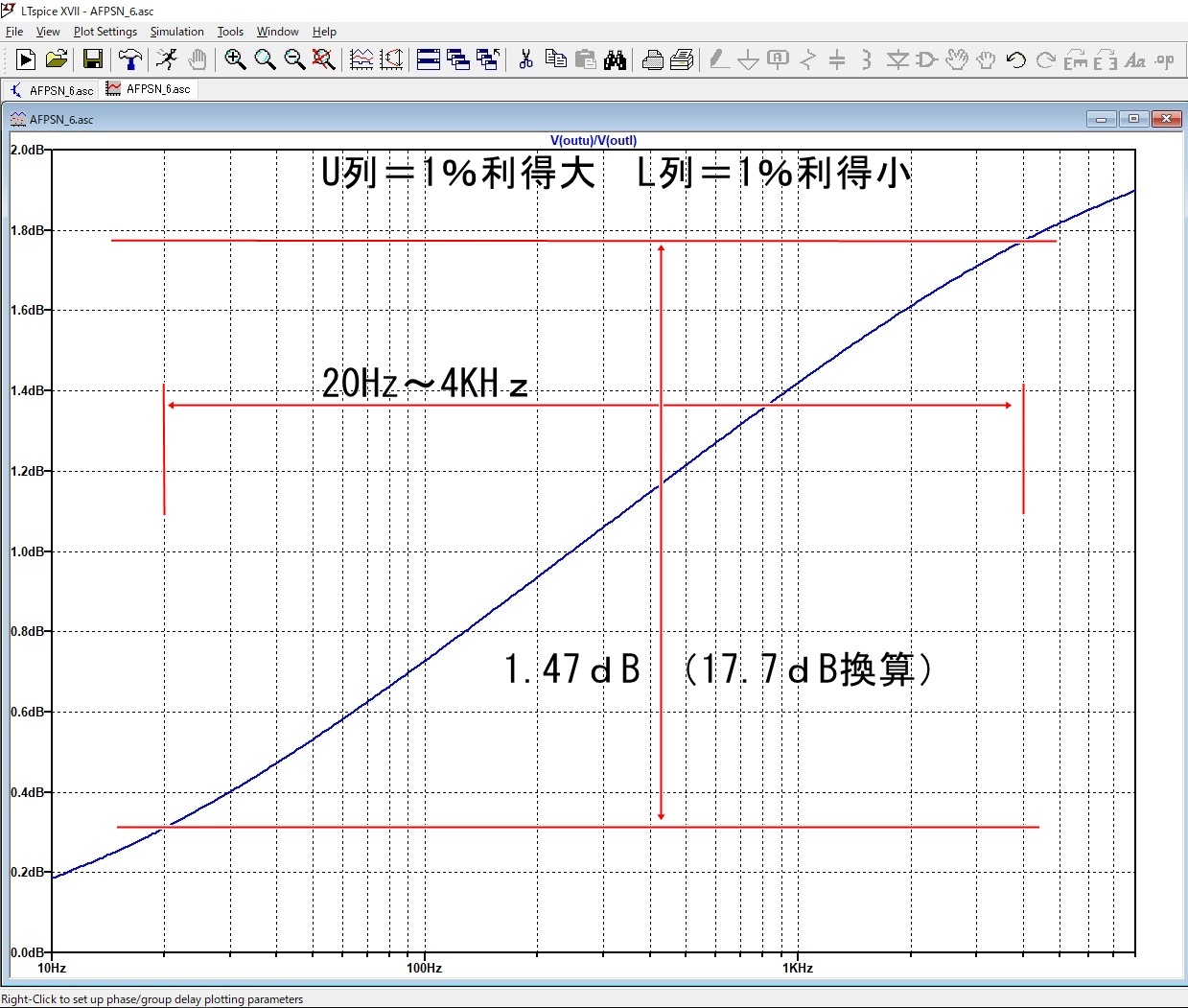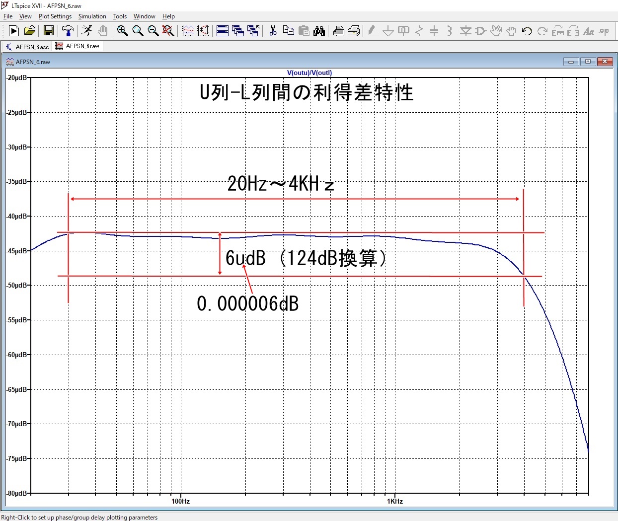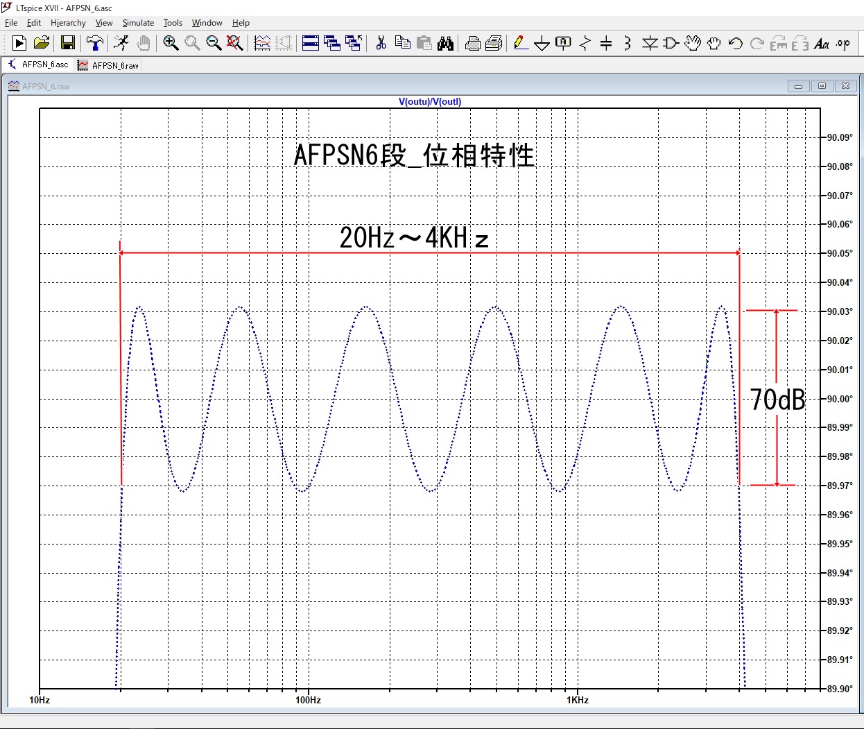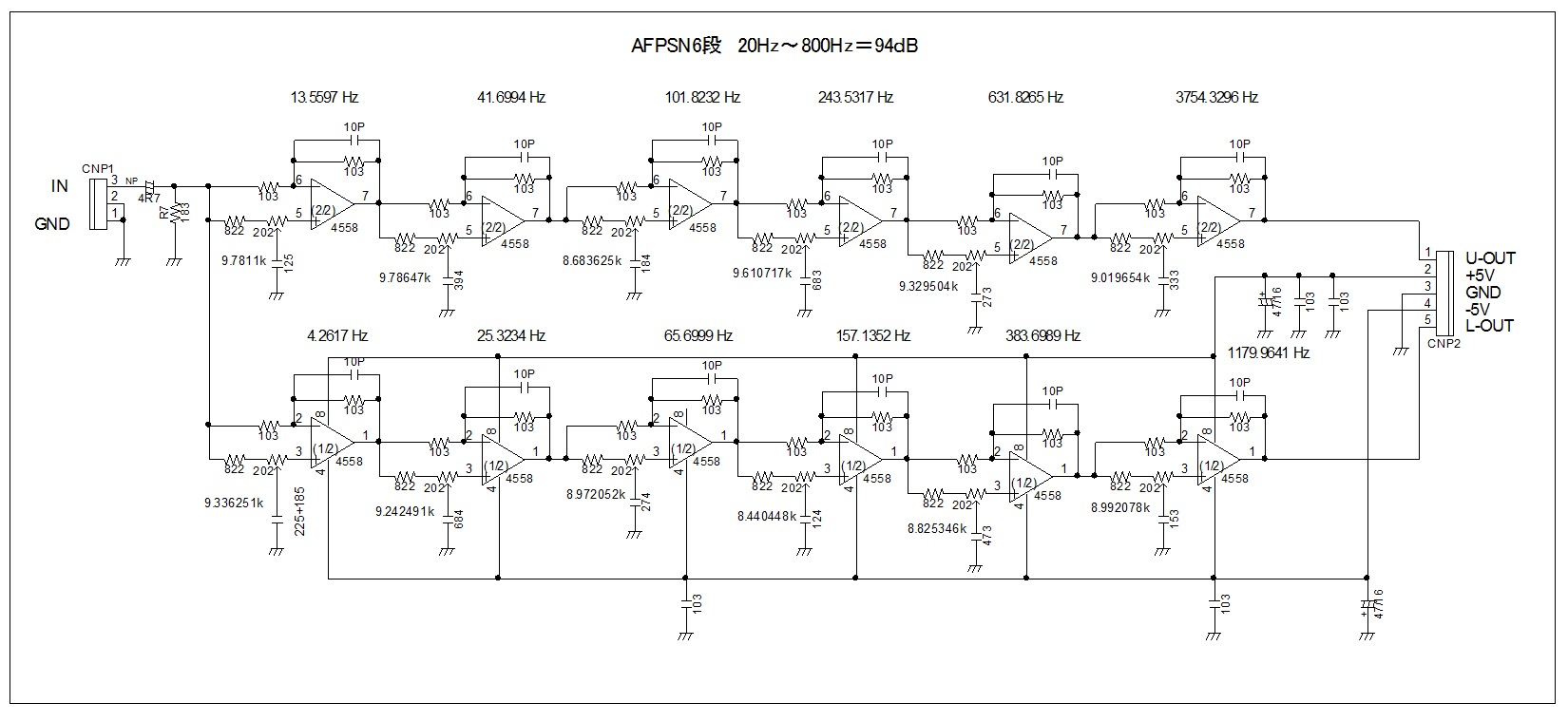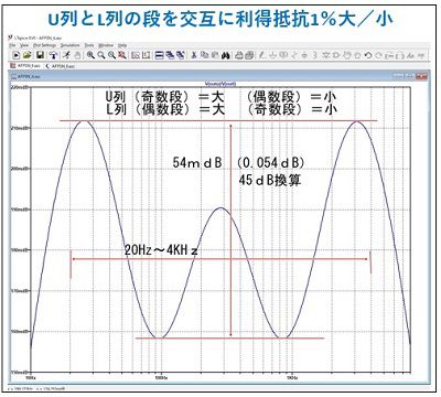 | 最も一般的に使用される 6段PSN 20Hz〜4KHz(70dB) この6段PSNを例にしてU列とL列の振幅バランスについて、LTSpiceを使って考察してみる。 |
