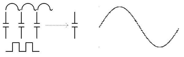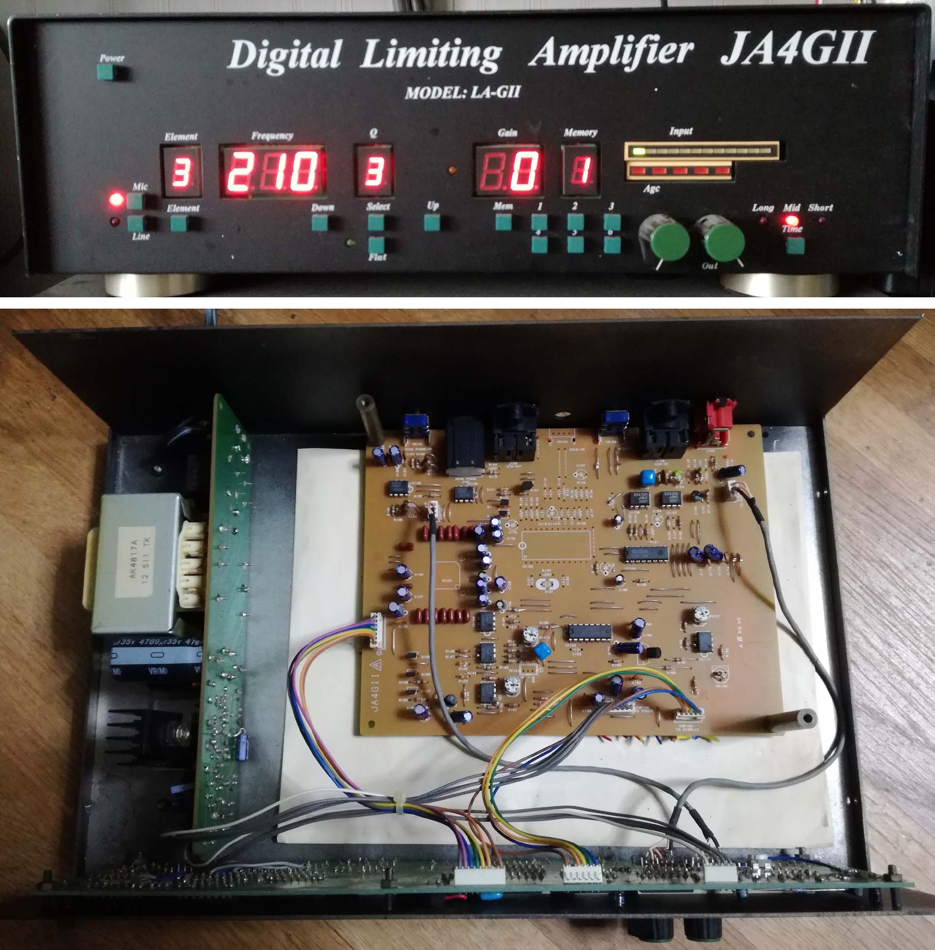 そもそも自作派にとって一番手に付け易いブロックが、マイクアンプとか音に色付けするトーンアンプとかスピーチアンプ類が一番多く作られているのではないでしょうか。最近のメーカー製機器では中は触り難く、周辺機器としてのアクセサリーは多く自作されています、その中で送信機としては、ある一定の出力以上は出ないように制限をかけるALC機能が付加されています。大きな声をマイクに向かってはり上げるのはスプラッターをまき散らす要因となります、歪の少ないスプラッターのない電波が良い音に聞こえると思います、Hi-FiSSBと言う言葉を耳にしますが、Hi-Fiの定義が疑問です、そもそも3KHz帯域SSBでHi-Fiはあり得ないと思うのですが、おそらく3KHz帯域内でのより聞きやすい(耳あたりの良い)音をHi-FiSSBと称しているのだと思います。私が無線を再開した頃(1987年頃)にQSO話を聞いていると、送信機のALCを振らせては絶対ダメだとかスプラッターが出るからマイクゲインを下げろとか、よく耳にしました。たしかに、定格100W送信機では出来るだけ常に定格出力で運用したいものです、その結果オーバードライブとなり歪んだ電波となっていました。そこで、いくら大声をはり上げても歪電波とならないようにリミッティングアンプたるものを自作しました。しかし、自作のきっかけは各局のQSOを聞いていて非常にパワー感のあるバックノイズのデカイ信号でコックピット感覚の電波に憧れて、どうすれば、このような電波が発射出来るのか、マイクゲインを上げれば可能だがスプラッターもなく歪もないパワー感のある信号を生成したかったのです。![]() 一般的にはフィード・バック型で、出力レベルが目標とするレベルを超えると前段の利得を抑えるタイプで結果がオーバーしなければ制御出来ません。出力レベルを検出してから利得制御するまでの時間をアタック時間と称し、この期間を如何に短縮するかがポイントになります。フィード・フォワード型は目標とする出力レベルを利得制御回路の後段から信号検出するのではなく、前段から検出し、だいたい出力レベルはこんなもんじゃと予測をして利得を制御する方式で、これでもアタック期間をゼロにすることは困難である。過大入力信号の検出を前段から検出するか後段から検出するかで方式が分かれます。更に、アタック期間による歪を完全に解消する方式としてフォワード遅延型がある、これは利得制御するための検出信号が生成されるまでの時間(それ以上の時間)を遅らせることにより、先回りして利得制御することによりアタック歪を完全に解消するものです。 【フィード・フォワード遅延型】 この方式はレベル検出した信号が、レベルが規定値を超えたと判断し利得制御するまでの時間(アタック時間)以上の時間値を遅延させることにより、この時間だけ先回りしてレベル制御しアタック歪を解消します。問題なのは遅延素子として使用するデバイスがS/Nの良い歪の少ない素子が存在するかどうかです。全体をデジタル化することにより構成すれば容易に出来ます、本信号をデジタル化する場合はアナログ→デジタル(A/D変換)、デジタル→アナログ(D/A変換)ブロックが心臓部となり、特に自作となると変換部のレイアウト配線処理で大きく性能を左右します。遅延素子として実現可能なものは、①BBD(バケツからバケツへ電荷を転送する)デバイス ②昔のオーディオエコーシステムで使用された残響バネ ③RAMへのリードライト処理 の3種類位考えられます。 ① BBD 信号をサンプリングして次段へと供給し、段数が多い程長い遅延時間が確保出来、サンプリング周波数が低い程長い遅延時間が確 保出来るCDのサンプリング(44.1KHz)と同じように理論的な再生周波数は44.1KHz/2=22KHzとなるが、 サンプリングノイズ を考慮すると最高再生周波数の4倍以上が望ましい、となると、ここに使用するサンプリング周波数>3KHzX4=12KHzとなり、必 要とする遅延時間値の段数を選択することになります。 しかし、この種のデバイスはカラオケ機器に開発されたもので50dB以上 の歪を得ることは困難です。 ![]() デジタル信号処理と考え方は同じで、サンプリングは連続時間を離散化(連続していないとびとびのこと)したもので一定時間 毎に数値化する、この量子化したデータをデジタルと称している。 ② 残響バネ 昔のステレオ音響装置(真空管時代)は、エコー機能を実現するために用いられた部品で、電気信号をトランスデューサーで械振 動に変換し機械的バネを通過させ再度トランスデューサーで電気信号に戻す機能です。バネの長さで遅延時間が決まり帰還ループ させ帰還量をVRで可変しエコー機能を増減させ、真空管アンプを製作した頃に遊んだ記憶があります。本部品は帯域がとれません ので不向きです。と言うより時代錯誤です。 ③ RAMへのリード/ライト処理(デジタルディレー) 本命は、この方式になるでしょう、サンプリング>12KHz、段数はRAMの容量となります。 ![]() (書き