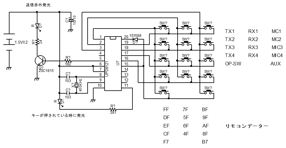 | 送信ユニットは、38KHzの赤外線でデーター配列はNECのリモコンに準拠した13キーです。受光ユニット(GP1UXC41QS)で検波したパルス配列は、CPUのC番へ入力し、13キーをソフトデコードし、14番〜26番へ出力されます、送信ユニットのキーが押されている間は、各キーに振り分けられた端子から、’H’レベルが出力され続きます、キーを離せば’L’となります。 本送信ユニットには難点がある。 冬場、温度が低いとリモコン送信信号が出ない。温めてやるとOKとなる、実質、冬場には使用出来ない。 |