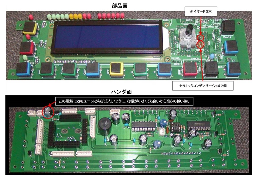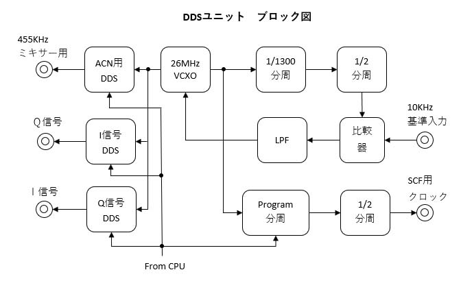 【仕様】 ① ダイレクトオールバンドPSN送信機。(3.5M/7M/14Mに変更) ② 各バンドの逆サイドバンド調整値(Phase/Balance)は記憶保持。 ③ ACN(オート・キャリア・ヌル)の検出は、455KHzで生成。 ④ 出力=最大250mW。 ⑤ LPF=ActuveとSCFの切り替え方式。 ⑥ HPF=33Hz/48/70/85/100/125/150/185Hzの8ポジ切り替え。 ⑦ MODE=LSB/USB/ISB 【オールバンド・ダイレクト送信機のポイント】 ① シングルコンバージョン/ダブルコンバージョンのケースでは、どのバンド周波数においてもSSB生成器では 固定キャリアで 構成出来きます。(例えば455KHzとか128KHzとか)よって、SSB生成器のキャリアが固定で動かないため、PSN変調器に使用 するためのI/Qキャリア生成が容易で、RF-PSN機構も簡単です。ところが、オールバンド・ダイレクトとなると同一バンド内に おいても周波数が変わり、安定したI/Q信号のキャリアが必要となります。 ② ①を達成するためには、128KHzや455KHzの固定キャリアI/Qを生成するために、4倍発振させ1/4手法でI/Qを生成し、VR によりRF位相の微調整(RF-PSN)をすることにより容易に達成出来ますが、 固定キャリアであるため簡単であります、周波数 が高く可変となると容易ではない。 例えば455KHzの位相=90度では、時間軸=550nSであるが、3.5MHzでは71nS、14 MHzでは17nSと小さく、周波数により数値も変わる。この90度位相の時間軸絶対値が小さい程、逆サイド特性がクリチカルと なる。例えば1nSの変動に対して、位相変動からみると、455KHzでは90/550=0.16度の変動、3.5MHzでは90/71=1.27度の 変動14MHで90/17=5.3度の変動となり、ダイレクトではVRによるアナログ調整の手法はとれない。当然、4倍手法によるキャリ ア生成の手法もとれない。又各バンド毎にRF位相の調整値を確保する必要がある。固定キャリアでのRF位相調整は、下図の ような手法で行うが、このような固定遅延によるアナログ調整では、周波数が変化することにより遅延値は変化しないものの 結果として位相シフト量が変化するため、この手法は採用出来ません。 ![]() ③ 従って、ダイレクト変調用のRF信号(I/Q信号)は、デジタル的にミリ度分解能で、時間軸遅延ではなく位相値の調整制御が必 要です、位相値制御であるため周波数が変化しても位相は不変です。但しバンドにより異なった位相調整値が確保出来ることが 必要です。これは変調回路においてバンドが変わる(周波数の変化量が大きくなる)と、個体差により最適調整値が変化ためで す。 ④ 以上の条件から、DDS回路を色々検討した結果、今回は最高に近い新しいDDSの採用を試みることにしました。ダイレクト受信機 で使用したDDSは、200MHzクロックでチューニングワード=48bitでしたから一般的に言われる割り切れないBITが捨てられ誤差 を生じると言われますが、48bitですから12乗以上は確保されます。つまり、基準クロックでロックさせますから、GPS/ルビ ジューム等の基準クロックを使用すれば基準精度と殆ど変わりはありません。しかしDAC=12bit仕様でしたから、この度DAC=14 bit仕様の400MHzクロックで1.8V駆動の低パワーのDDSを使用します。 しかし、難題が1つあり、48ピンQFPとパッケ-ジは小 型ですが、ピン間ピッチ=ウルトラSSOP(0.5mm)で、いままで使用したQFP80ピンではSSOP(0.65mm)でした。SSOPより 密度の高いパッの手ハンダは未です。 ⑤ 逆サイドバンド調整に関しては、 バンド内では200KHz位の周波数変化ですが、他バンド間では倍の変化となりますので個体差 による差分で、各バンド毎にRFPSNによる調整値とAFPSNのU列/L列バランス値が独立調整出来るようにし、この調整値を記憶さ せる。 ⑥ ACN(オート・キャリア・ヌル)を実現するためには、周波数が変化するため その都度、現状周波数のキャリア検出を行うこと ことは出来ません、今まで製作してきた機器はダブルコンバージョンでIFのポイントでキャリア検出を行うことが出来た、ダイ レクトではキャリア検出専用としてのミキサーを設け、 本機では455KHzで検出を行う。本回路は送信信号ルートとして経由す る訳ではないので、信号品質に影響は与えません。 ![]() 操作マニアル 調整法と確認法 ![]() 【DDSユニット】 ![]() マスタークロック周波数は、26MHzで外部基準クロック(10KHz)にロックさせ全てのクロックは、このマスタークロックから生成します。ダイレクトPSN変調するためのI/Q搬送波は、AD9951(14bit-DAC)DDSを使用しIQ間の位相差はRF-PSN機能として位相単位で制御出来ます。ACNとしてキャリア検出用のミキサーへ供給する搬送波は、AD9851(10bit-DAC)を使用し常時、送信周波数+455KHzの搬送波を出力します。SCF用クロックは、100倍クロックのSCF(MAX294)を使用しているため、カットオフ=3.0KHzの場合は300KHzのクロックを供給します、BCDプログラマブル分周器で26MHzを分周し、100Hzステップでカットオフが設定出来るようにしています。 マスタークロック(26MHz)を外部10KHzにロックさせる比較器は74HC86(X-OR)を使用しており、26MHzからの10KHzはデューティー50%を供給し、外部10KHzが入力されていない時は、比較器出力は10KHzのデ