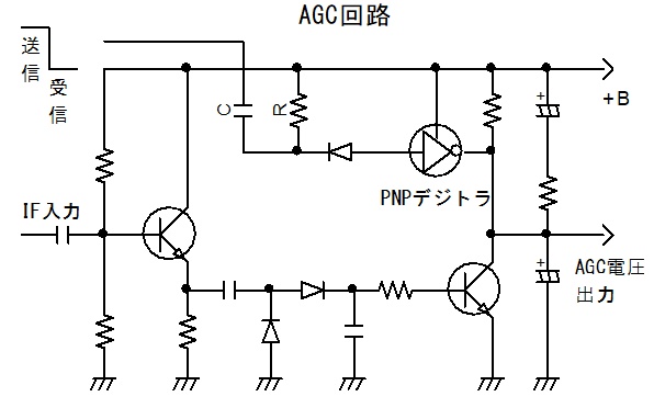 | AAGC回路の改造 右図は一般的なAGC回路であるが、AGC電圧が +B値である時に受信感度が最大となる回路であ る。システムとして受信モードに切り替わった 瞬間には最大感度にする必要があり、その期間 はC/Rの時定数で決める。 ![]() |