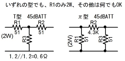 ![]() Pick-UP内部に使用するATT(1段目のATT)は、T型でもπ型でも、R1の抵抗は2Wを使用、その他は何でもOK。2段目以降も何でもOK。 |