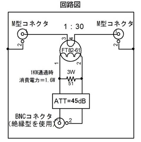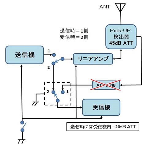 | 一部、構成を変えました。Pick-UP検出器から受信機の間は何も設置しない方が望ましい。検出器内部のATTと受信機内部のATTで構成することが望ましいです。45dBATT+20dBATT=65dBATTで、1KW送信でS9+35dBですから、1KW以下のパワーではもっとATTは少なく設定した方が良いでしょう。 |