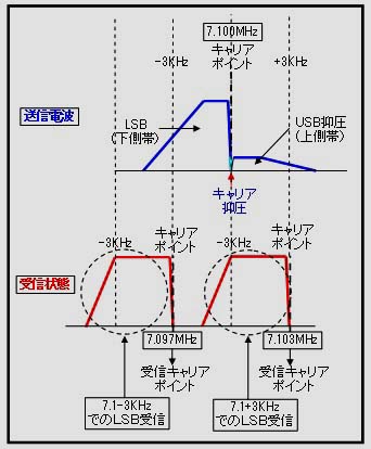 SSB交信の中でよくこんな話を耳にすることがあります。例えば7.100MHzで交信中に7.100+3KHz=7.103MHzで交信している局が3KHz下の7.1MHzに出ている局はキリキリ受信機で聞こえて邪魔じゃ、下の局は帯域が広過ぎるんじゃとか、逆に7.100MHzに出ているLSB信号が7.097MHzで受信しているとシャボシャボと混信になるから、7.100MHzの局に帯域を狭くして下さいと言うと、お前の受信機の帯域が広過ぎるんじゃ、受信機の帯域を狭くすればよいじゃんとか、いわゆるSSB(LSB/USB)の発射電波、受信(復調)の理屈が把握出来ていない局がたまに感じられます。こんな話があります、LSB電波の場合例えば7.100MHzで交信している局がいる、電波を発射したいのだが7.1M-3KHz又は7.1M+3KHzのどちらであなたは発射しますか? ある局は下の局がキリキリ聞こえてくるのがいやだから、相手もそのはず、だから7.1M+3KHzに出る と言われる方がおられます。一般的には耳への感じ方ではキリキリよりシャボシャボの方が耳に優しいです、しかし、原理からすると下の局がキリキリ聞こえるのは、受信機の設定で帯域を狭くすることにより解決出来ます、しかし、上の局のシャボシャボは、受信機の帯域では解決出来ません、受信キャリアポイントに上の高域成分が被ってくるので避けようがありません。よって、原理的には7.1M-3KHzに出るべきと思いますが?