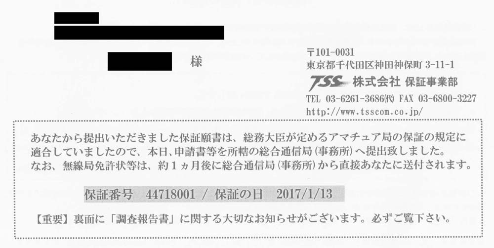 | 私の場合、現状 第1送信機=1.9M/50M=200W 第2送信機=144M〜2400MHz 第3送信機=3.5M〜28MHz=1KW ハイパワー(500W/1KW)局での申請時の注意点 @ JARDへの申請ではなく、TSSへ申請します。 A 200W以下の送信機番号は、’取替’で申請します。(私の場合は、第1送信機/第2送信機) B 1KW送信機番号はそのままにしておき、決して変更しないこと。(私の場合は、第3送信機) 第3送信機を直接変更すると、これに接続されているリニアアンプが切れ、1KW電力が失効となります。 C 1KW送信対応するための、送信機を新たに増設します。(私の場合は、第4送信機となります) 【第1段階】 TSSへの申請内容 下記資料に返信用封筒を同封して送付します。保証認定完了後にTSSから所轄の通信局へ書類と併せて返信用封筒 も送付されます、提出後約1ケ月前後で下記のような認定通知結果が送られてきます。返信用封筒は長形3号(120X 235mm)定形に¥82切手を貼付。 ------------------------------------------------------------------------------------------------- ![]() @ 保証願書.pdf 第1/第2送信機は全て200W以下の機器であるため、’取替’、第4送信機は リニア接続用送信機で’増設’です。 A 事項書.pdf HF(3.5MHz〜28MHz)の出力値は200W以下。 B 工事設計書 第4送信機として自作機で申請、 電波形式として独立側波帯 (B8W) を追加しました。 C 送信機系統図 第1/第2送信機は、基本的にはJARL登録機種であるため、系統図は不要ですが 第1送信機は、200Wにするためのブースターを付加したため、この系統図が必要 第2送信機は、2.4GHzの機能が無いため、改造付加した2.4GHzユニットの系統図が 必要、増設の第4送信機は全系統図が必要。 【第2段階】 所轄の通信局への申請内容 200W以下であれば、第1段階で終了です、保証認定結果が所轄の通信局へ配信され、受理されます。200W以上 の局は、第2段階の手続きが必要です。新しく増設した第4送信機に現在使用中のリニアアンプが接続可能となるよう に下記資料の変更届出を行います。 @ 変更申請書(届出).pdf 変更 (部分) にチェックする。 A 事項書.pdf HF(3.5MHz〜28MHz)=1000W B 工事設計書.pdf 第4送信機の終段と、リニアアンプの終段を記載 C 系統図.pdf 現用送信機(第3送信機)と、増設した第4送信機が、現用のリニアアンプに接続可能となる ように構成する。(リニアアンプは現用品を記載のこと) 以上、約2週間前後で、所轄の通信局から受理通知がきます。又指定事項に変更のある場合は免許状も同封されます。 200W以下の局は、明確になっていますが、200W以上局に対しては具体的には未だ決定されていないそうです。エキサイターのみ対応しておけばOKなのか、それとも他に何か追加手続きが必要なのか、もう少しすれば結論が出るでしょう。 |