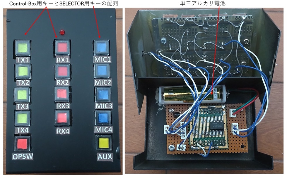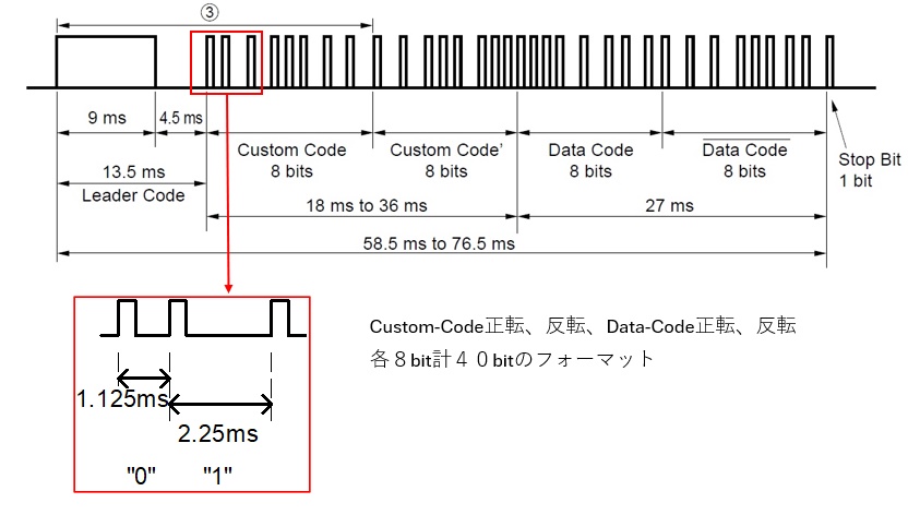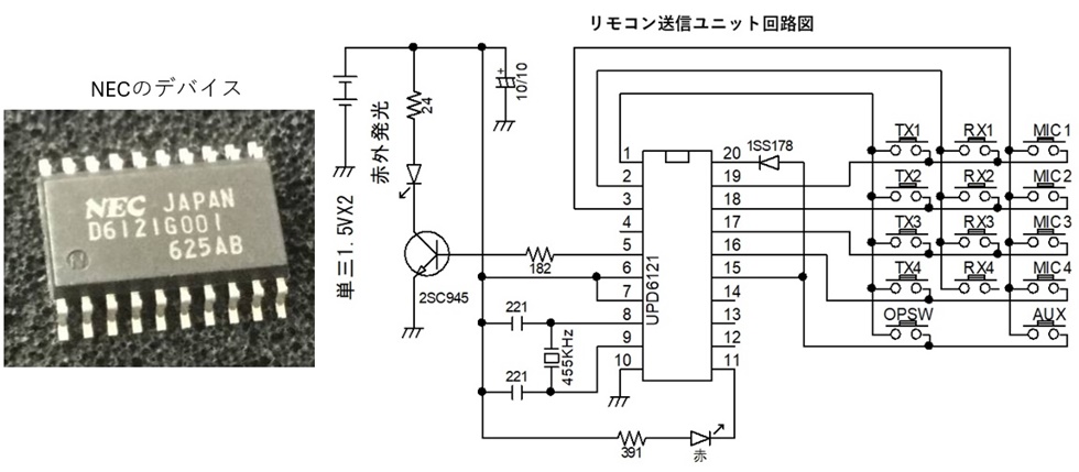 自作機のなかでリモコン対応している機器はMIC1〜MIC4を切り替える”SELECTOR”と複数の送受信機を切り替える”Control-Box”がある。これらに対応すべく秋月で販売されている送信ユニットを使用してみたが、冬場では暖めないと発信されないことがあり、不安定であるため、リモコン送信ユニットを作成した。![]() 【自作送信ユニット】 ネットでも購入出来る”UPD6121”のデバイスを使用してNECのリモコンフォーマットで作成する。 ![]() 発振器は455KHzのセラミックレゾネーターを使用しキーが押されている間は赤外発光から38KHzの搬送波でコード信号が変調されて発射される。J番に接続されている赤LEDは、赤外発射されている間は、このLEDが赤点灯します。 送信データフォーマット ![]() 【受信ユニット】 基本的にはNEC40bitリモコン信号をデコードする回路、デコード結果の信号を利用してリモコン機能を達成することが出来る。 受光ユニット(GP1UXC41QS)で検波したパルス配列は、CPUのD番へ入力し、デコード結果は、15番〜26番へ出力されます、送信ユニットのキーが押されている間は、各キーに振り分けられた端子から、’H’レベルが出力され続きます、キーを離せば’L’となります。JP=オープン時は、キーが押された瞬間デコード結果は50msのパルスが出力される。 ![]() |